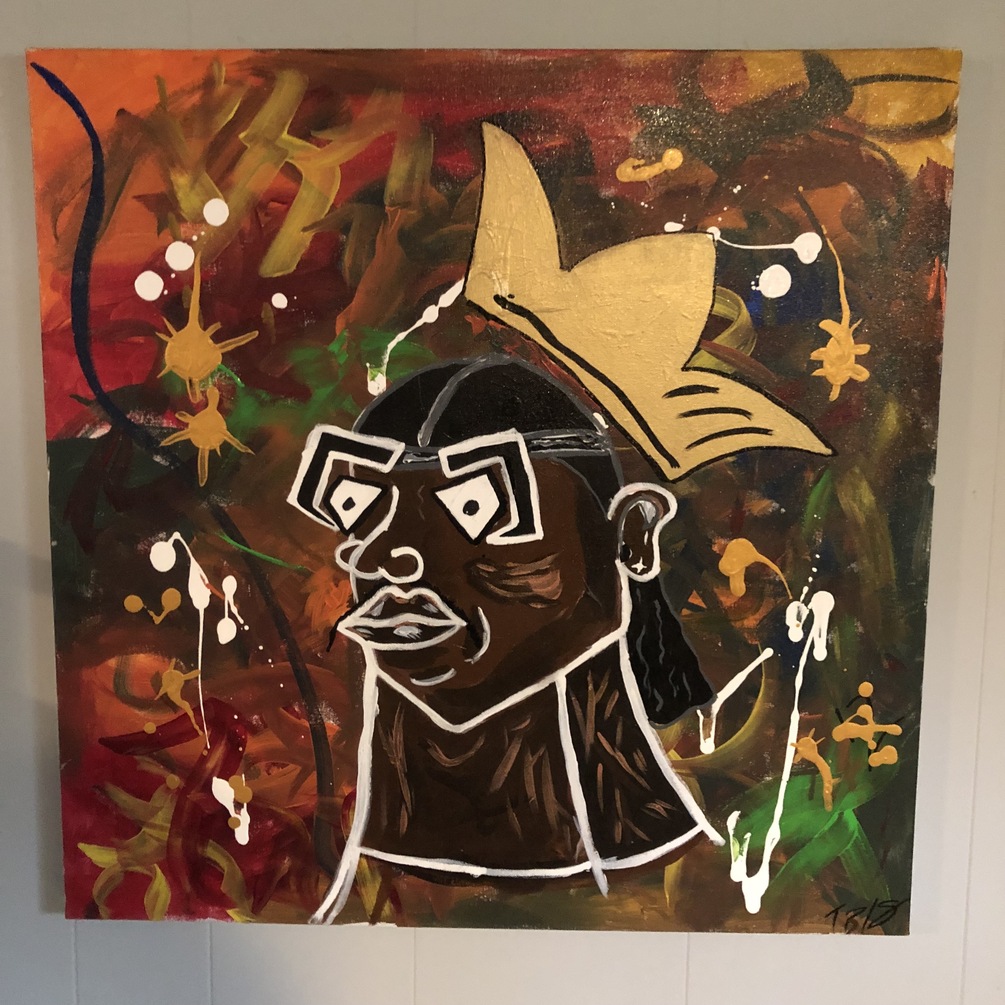 The First installment of my Ode to Mental health in the black community is "The Anxiety of an Urban King". The hand-painted acrylic painting displays a variety of colors that represent different levels of anxiety. While surrounding a crowned Black man who also happens to be wearing a durag. This piece is 30x30 and is looking for a new home! Could it be yours?